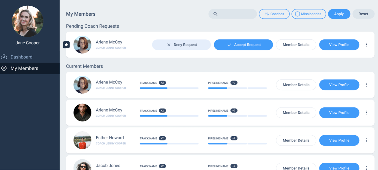 This dashboard lists all of the individuals you are coaching and displays additional information for each of them.