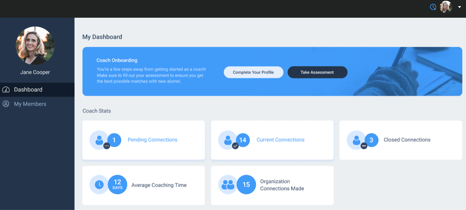 The primary coach dashboard provides a quick view of core stats for your connections and tasks. This dashboard displays the following: