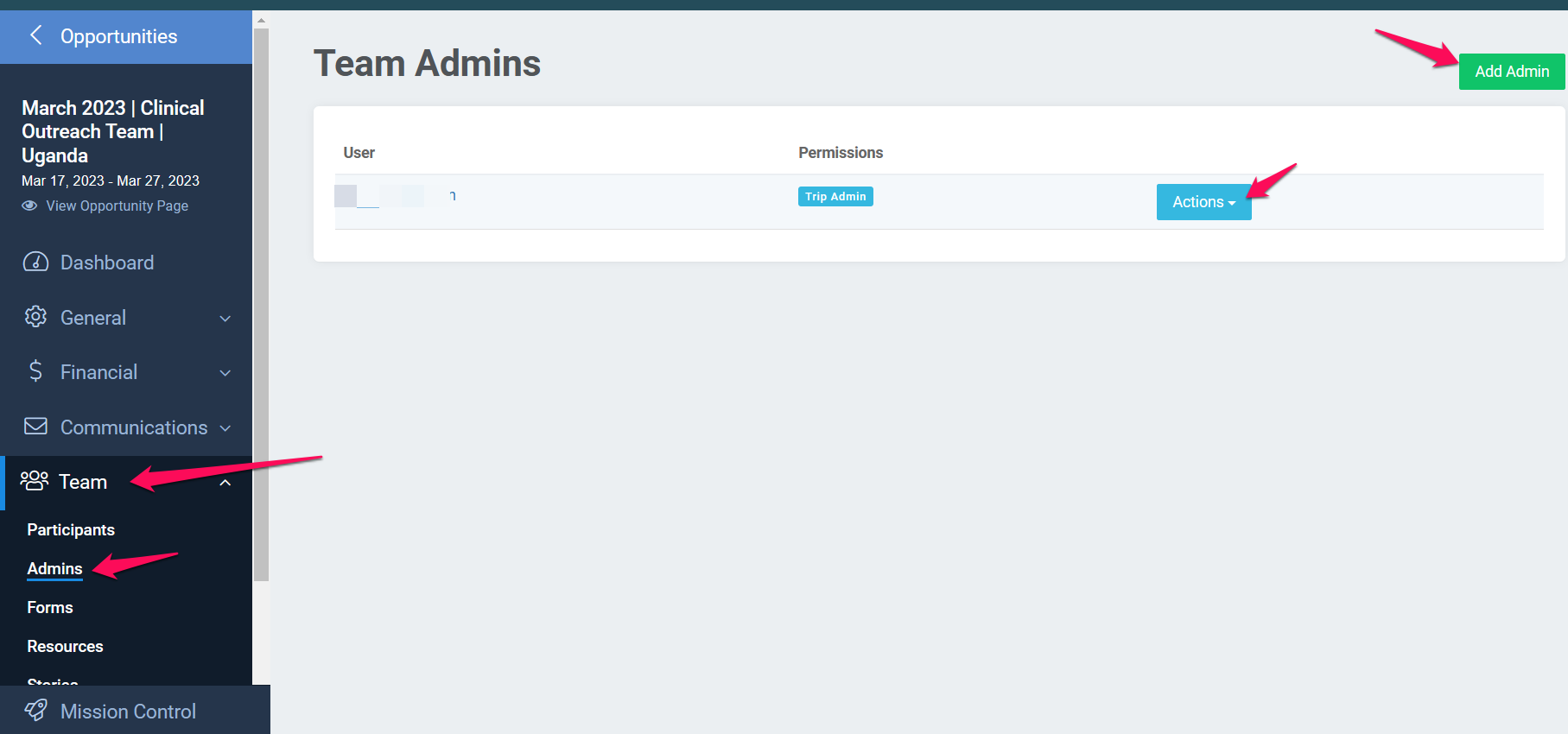 If you know which Opportunity the admin is assigned to, select that Opportunity Name on the left to bring you to that Opportunity’s page. Under Team, select Admins and locate that Admin’s name. Select Actions on the right side and you can Edit (if you are looking to edit what notifications or roles that Admin is responsible for, this is where you would go) or Remove the Admin.