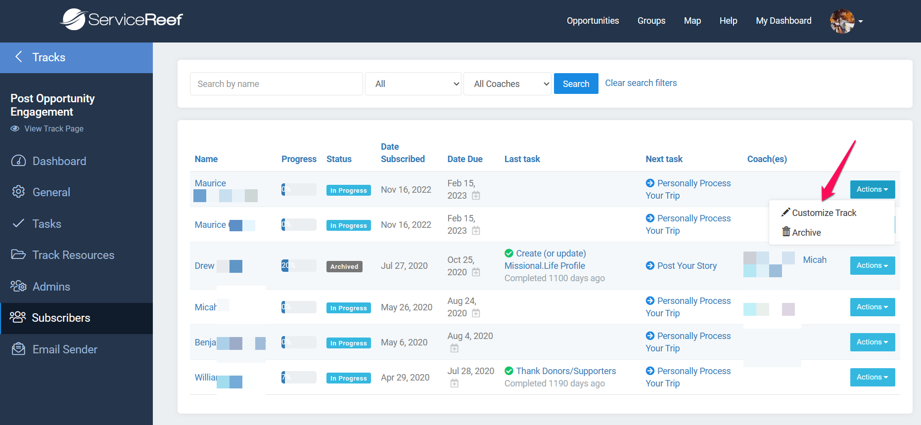 Once a person is subscribed to a track, you can go in and "Customize Track" for that individual.