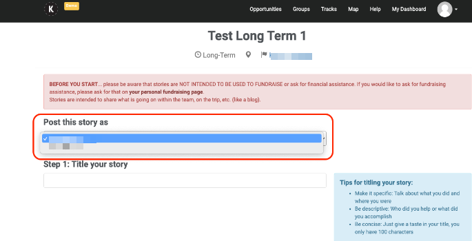 When an Organization Admin with “Stories” permission clicks “Share Your Story,” in the subsequent Story creation page, there is a dropdown that allows the Org Admin to select between posting as themselves, or as the Organization: