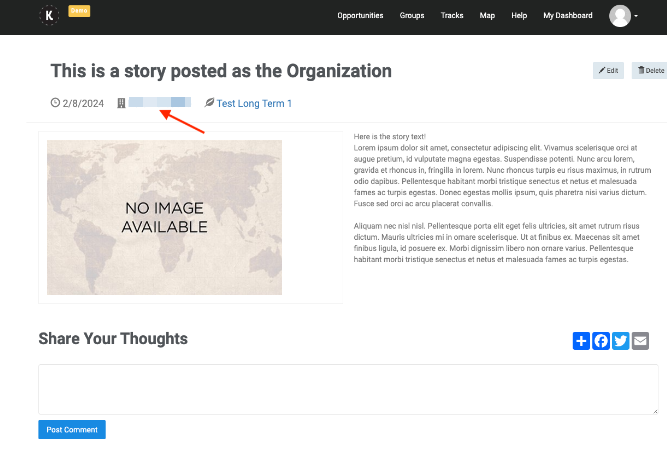 When the story is posted by the Organization, the author on the Story is now the Organization (the name hyperlinks to the Organization’s ServiceReef home page):