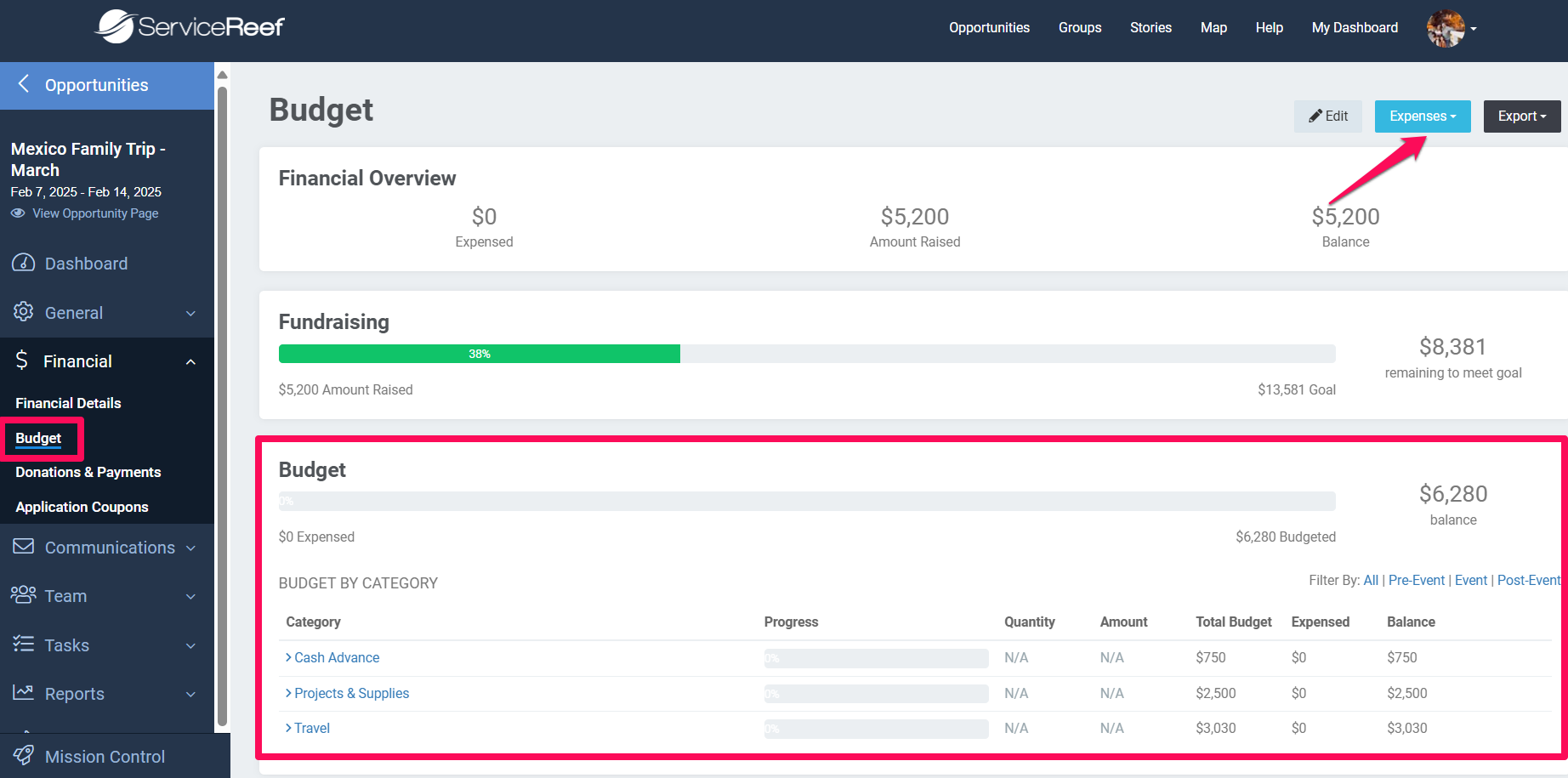 Managing the finances of your short term trip can be another major item of management and time. ServiceReef has created a powerful tool to help you build a budget, track expenses, and run reports. The budget tool is built inside each opportunity and allows the admin the ability to create a budget, the trip leaders the ability to post expenses, and the trip leader the ability to pull P&L reports at any time. There’s a whole lot more to this tool – we just wanted to give you a picture of what you could be doing for greater financial management. Have fun budgeting!