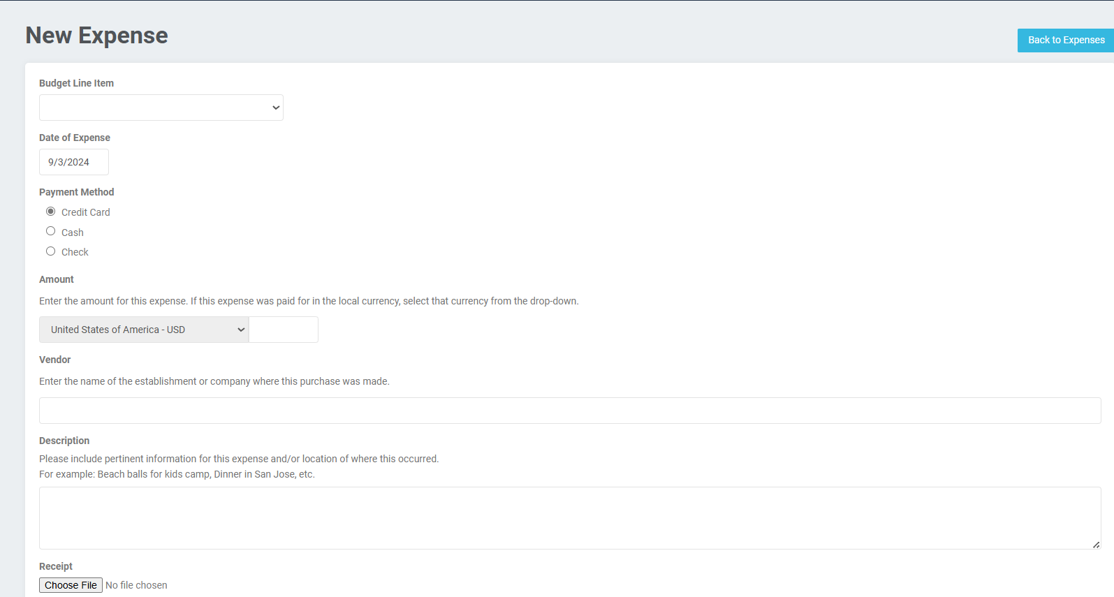 When adding Expenses, you will select the Budget Line Item the expense corresponds with, Date, Payment Method, Amount, Vendor, Description and the option to add a Receipt.