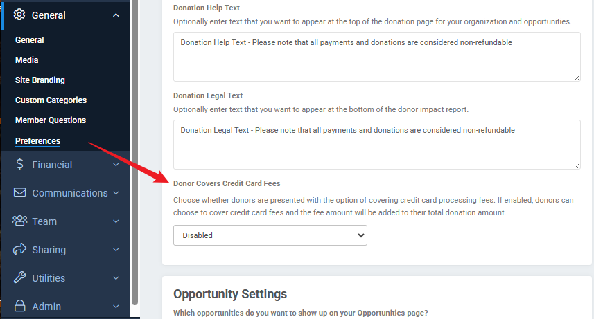 Find the setting titled Donor Covers Credit Card Fees.