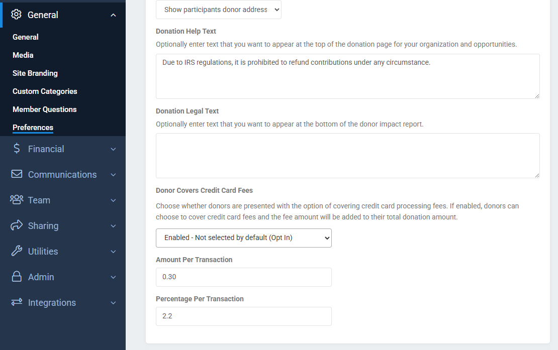 Percentage Per Transaction – A percentage of the donation amount to be calculated and added.