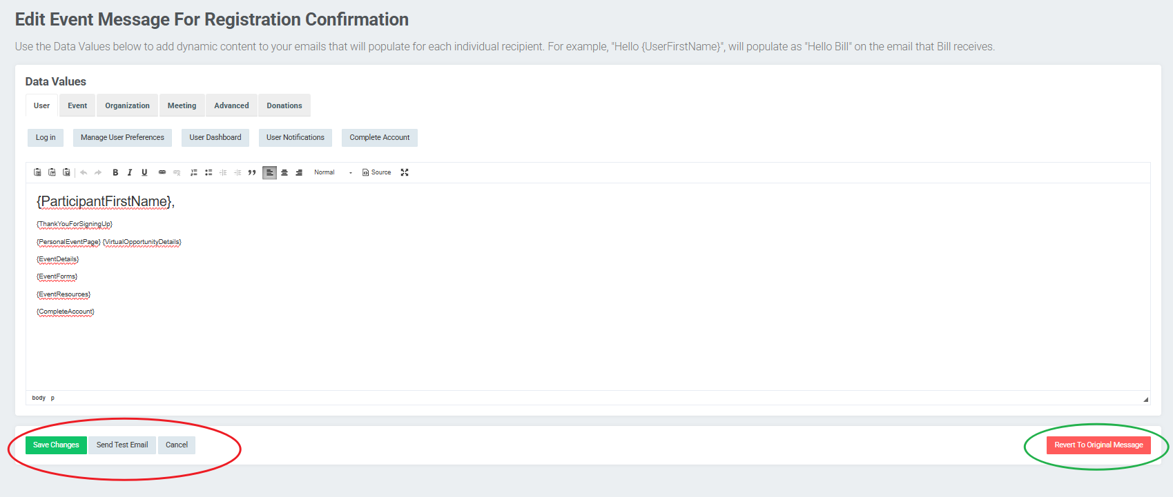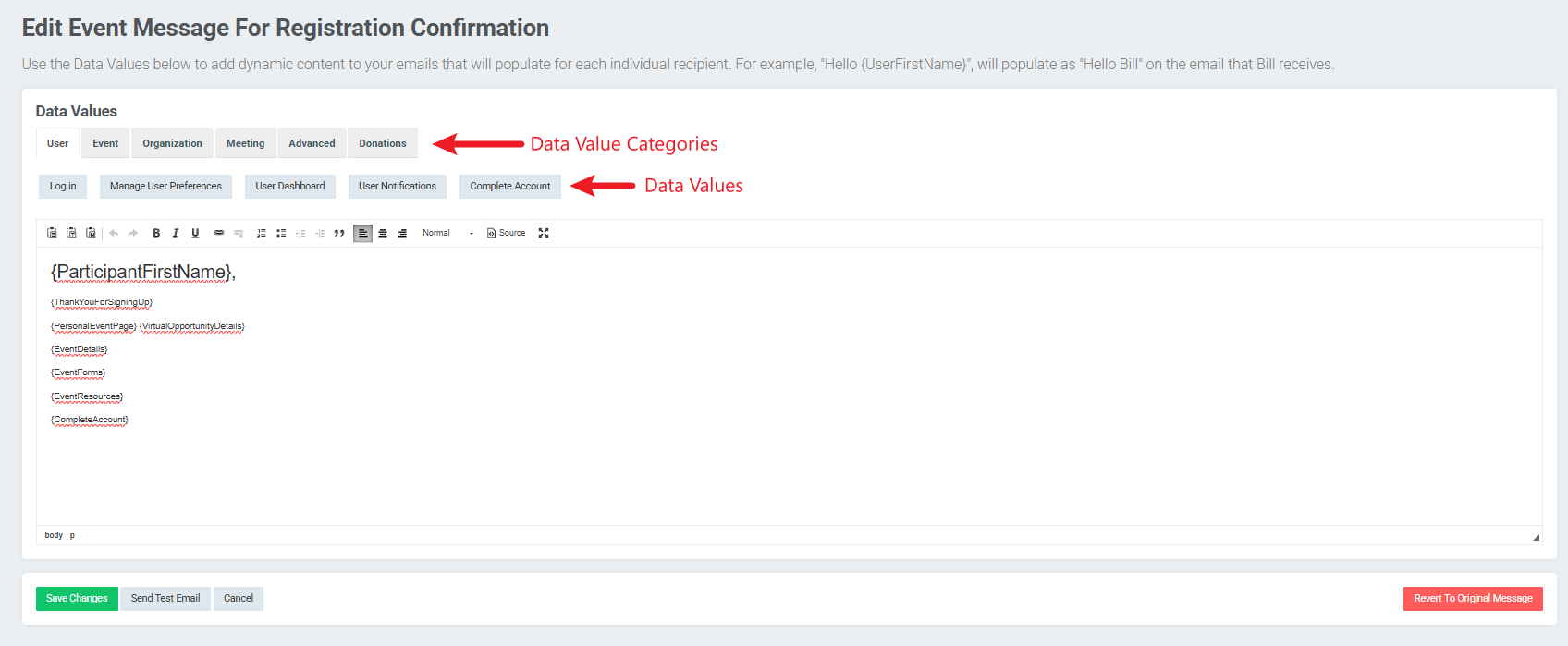 You can update the default message text directly in the text editor. Use Data Values to include dynamic content that automatically personalizes each email for the recipient.